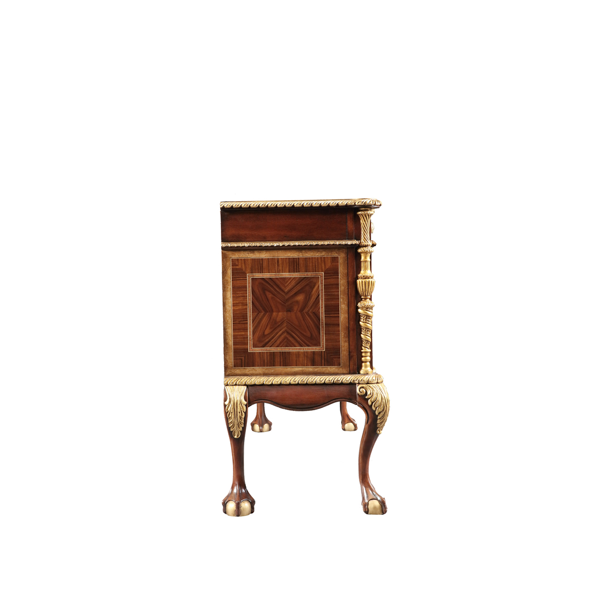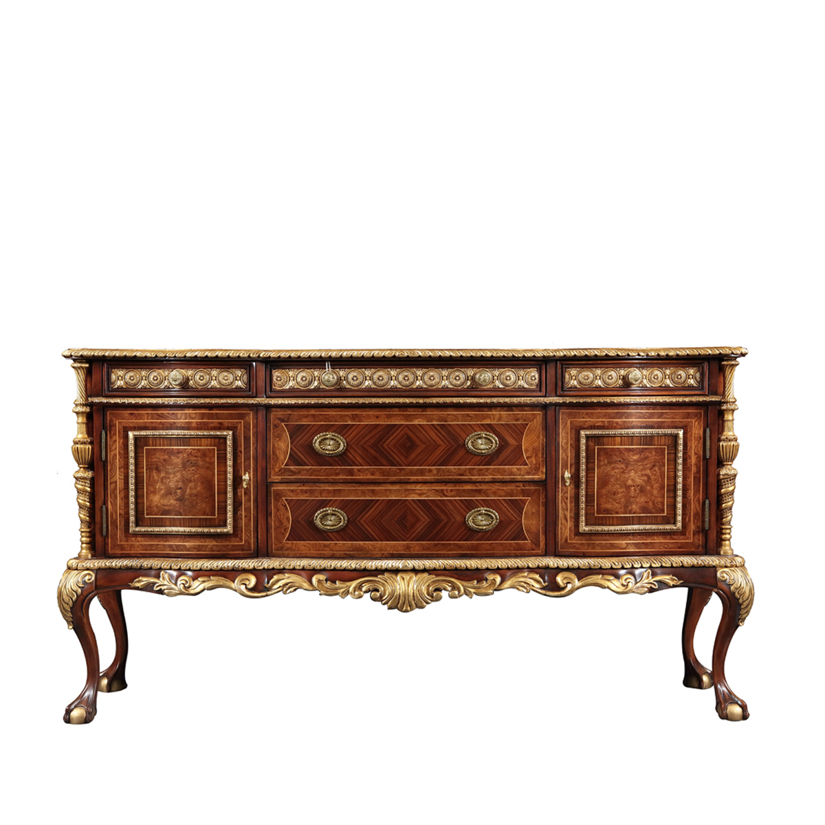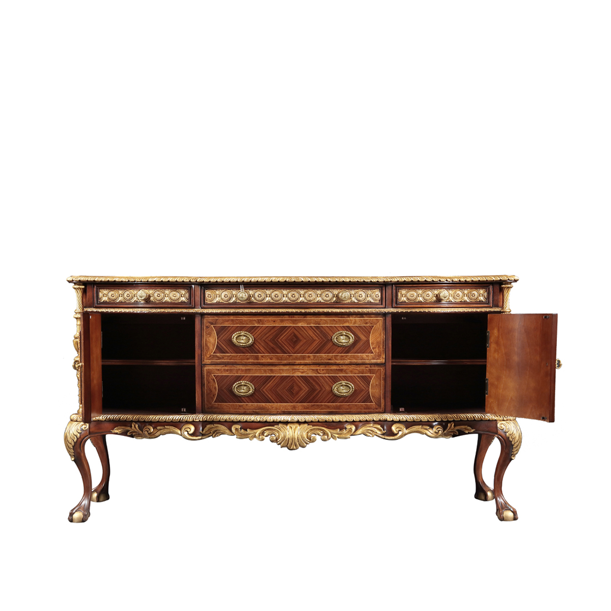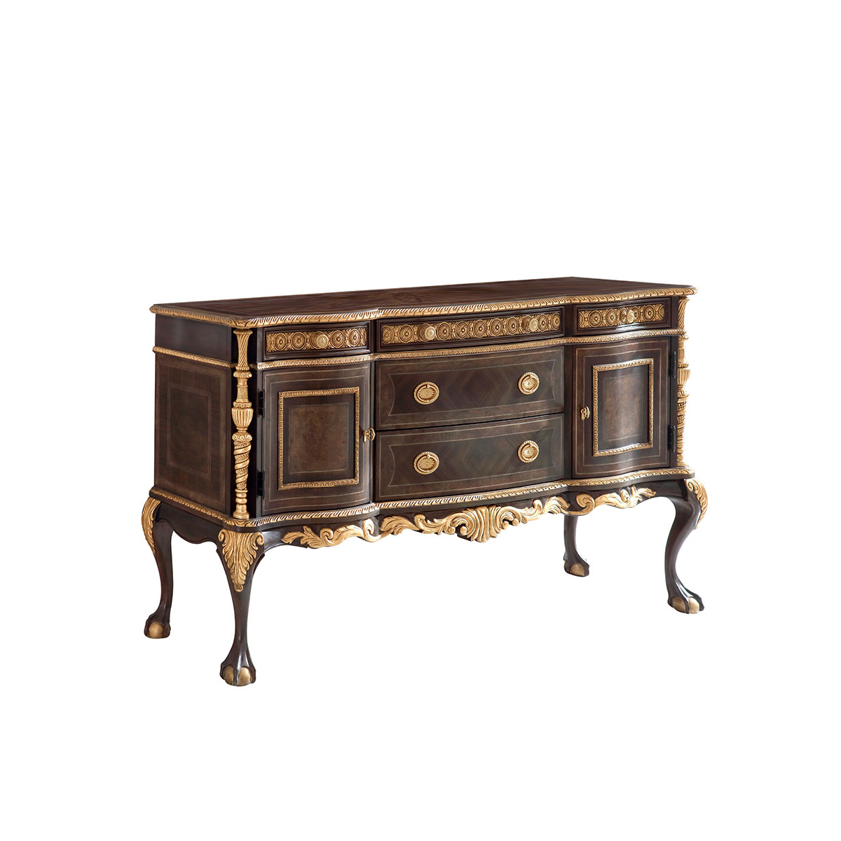 設(shè)計師從英國溫莎城堡中汲取設(shè)計靈感,靈動的裙擺輪廓勾畫莊嚴(yán)古雅的造型,采用材質(zhì)細(xì)膩而質(zhì)地優(yōu)良的桃花心木作基材,流暢的S曲線及爪球腳和層次豐富而紋理清晰的木皮拼花在墨綠色的斑駁古跡中釋放千年古韻。