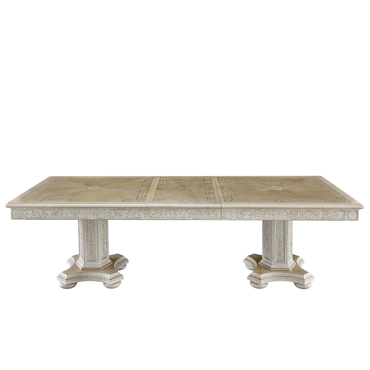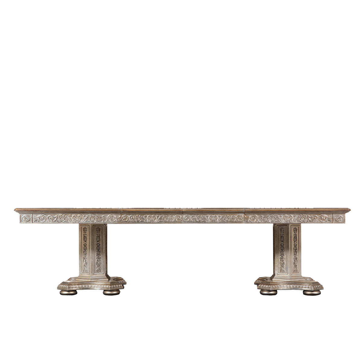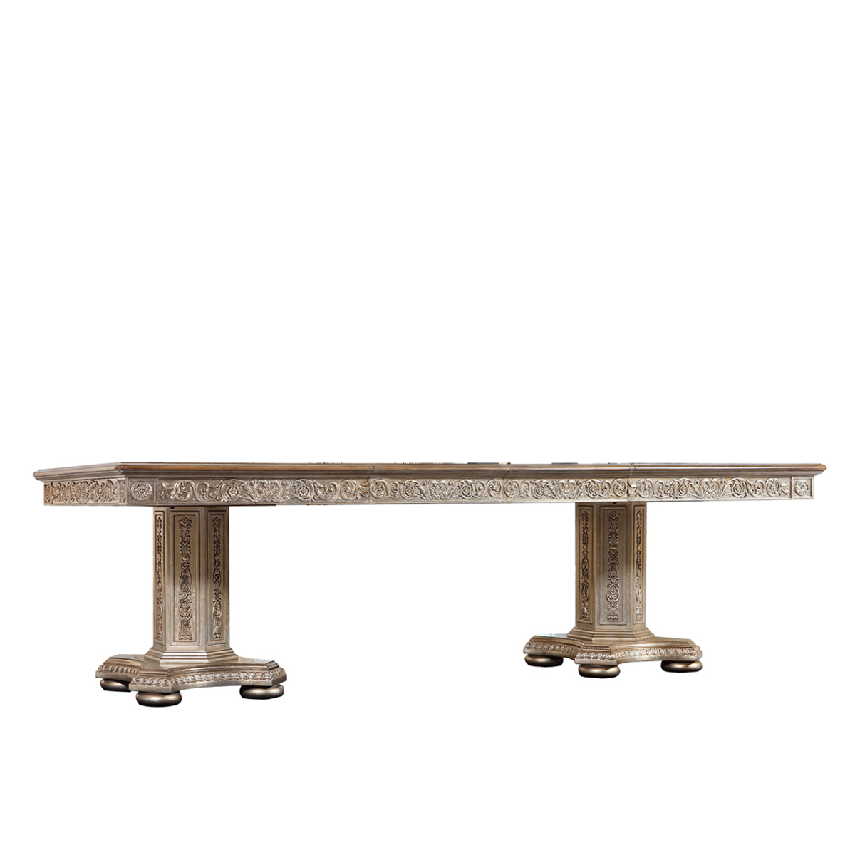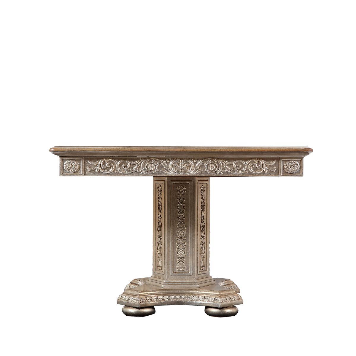 復(fù)古而有時(shí)尚感的涂裝,井然有序的雕刻,栩栩如生的花紋裝飾,紋理清晰呈花形放射狀散開的木皮拼花,遵循著對(duì)稱法則的桌腿,都如同將佇立千年的歐洲經(jīng)典建筑,將匠心凝結(jié)在了每一個(gè)雕花,每個(gè)細(xì)節(jié)之間。