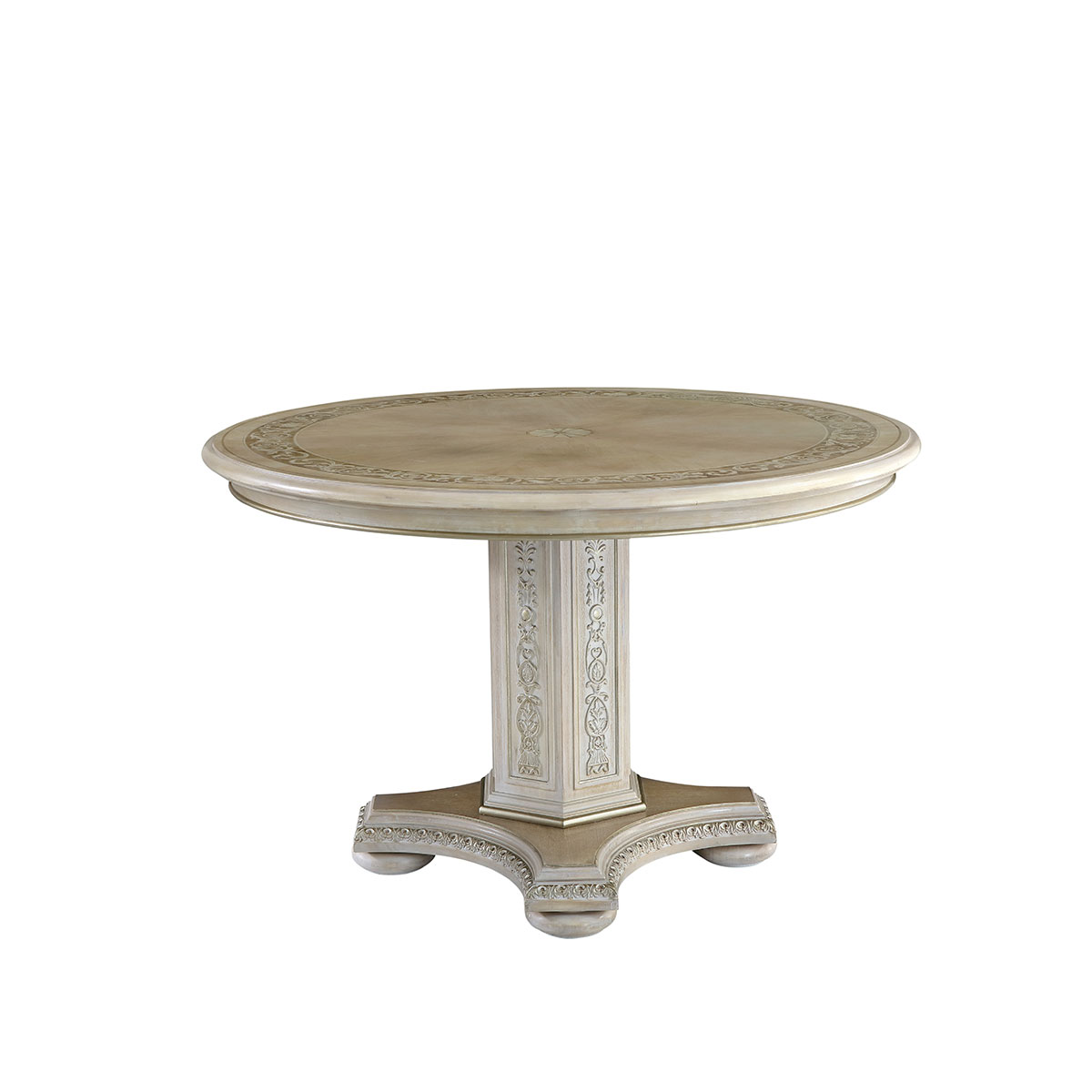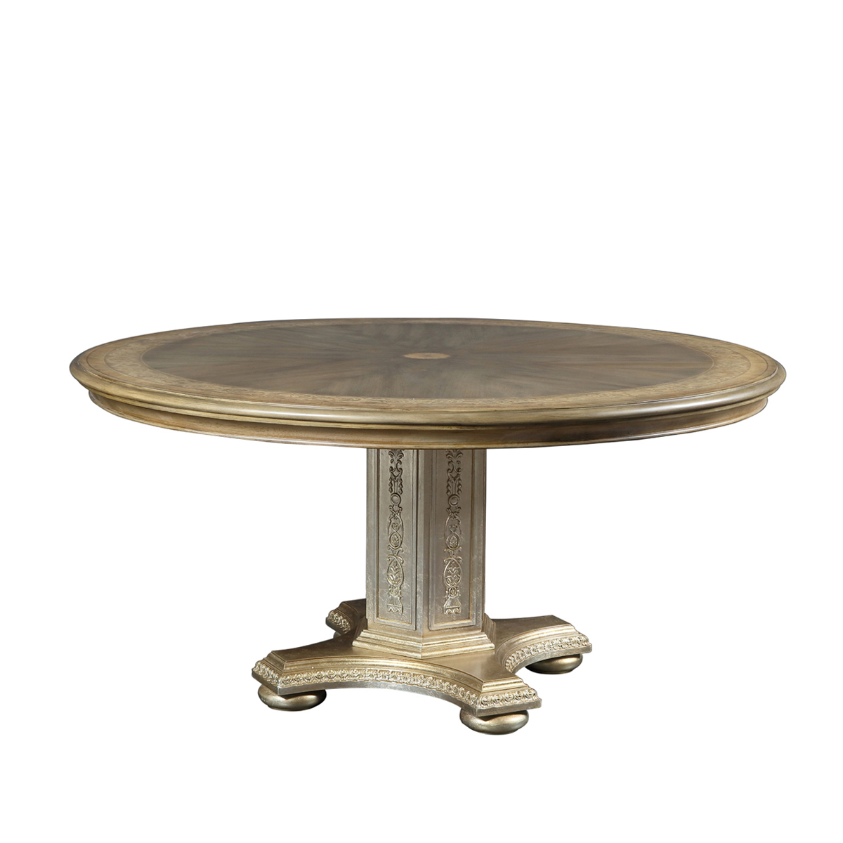 復古而有時尚感的涂裝,井然有序的雕刻,栩栩如生的花紋裝飾,紋理清晰呈花形放射狀散開的木皮拼花,柱形桌腿穩(wěn)重踏實,如同將佇立千年的歐洲經典建筑,將匠心凝結在了每一個雕花,每個細節(jié)之間。