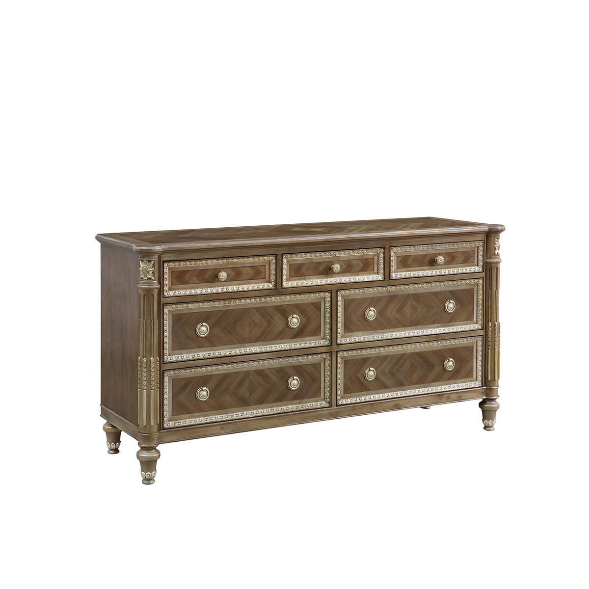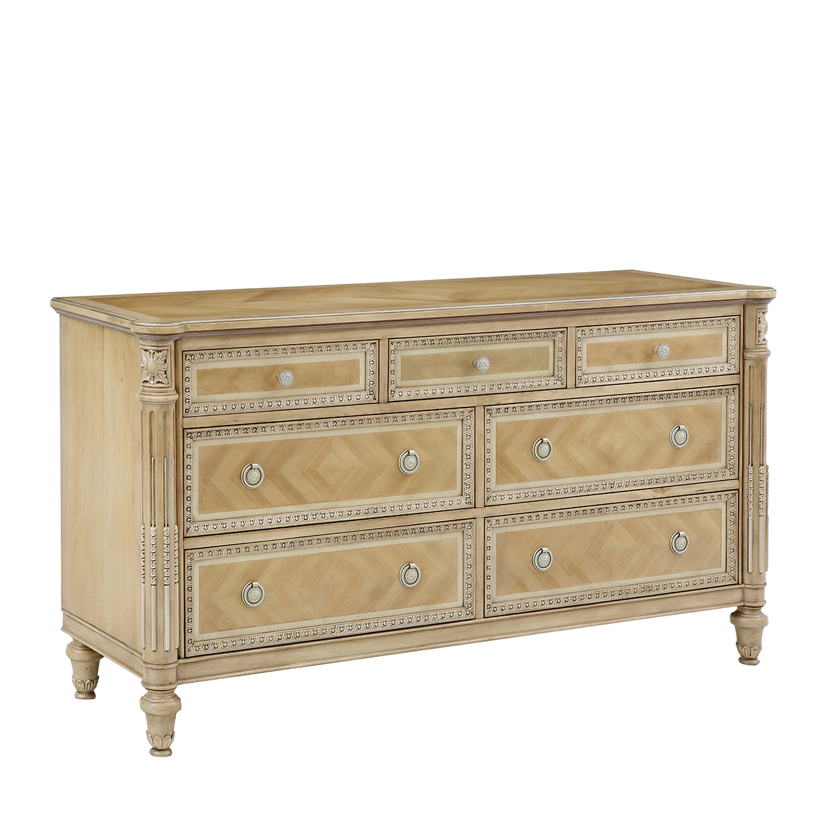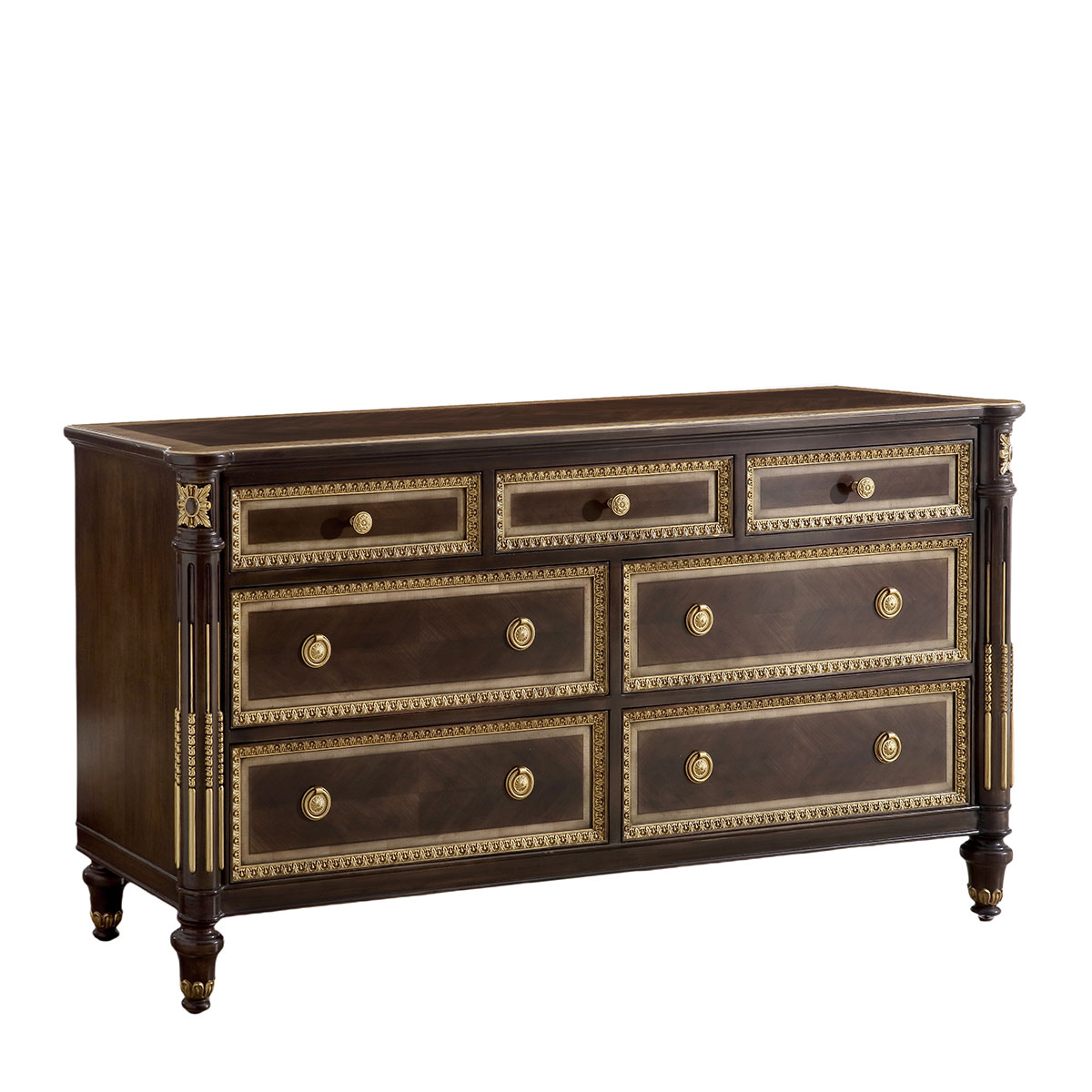 * 為表現法國路易時期的莊嚴和浪漫,以法國凡爾賽宮為設計元素。使用歌頌路易十四時期的太陽花雕刻,顯示其王權穩固地位的錐形腿腳設計,配以鉆石圖案的木皮貼面、古銅色的球形把手和貼金工藝,完美演繹了法式宮廷家具的奢華尊貴。