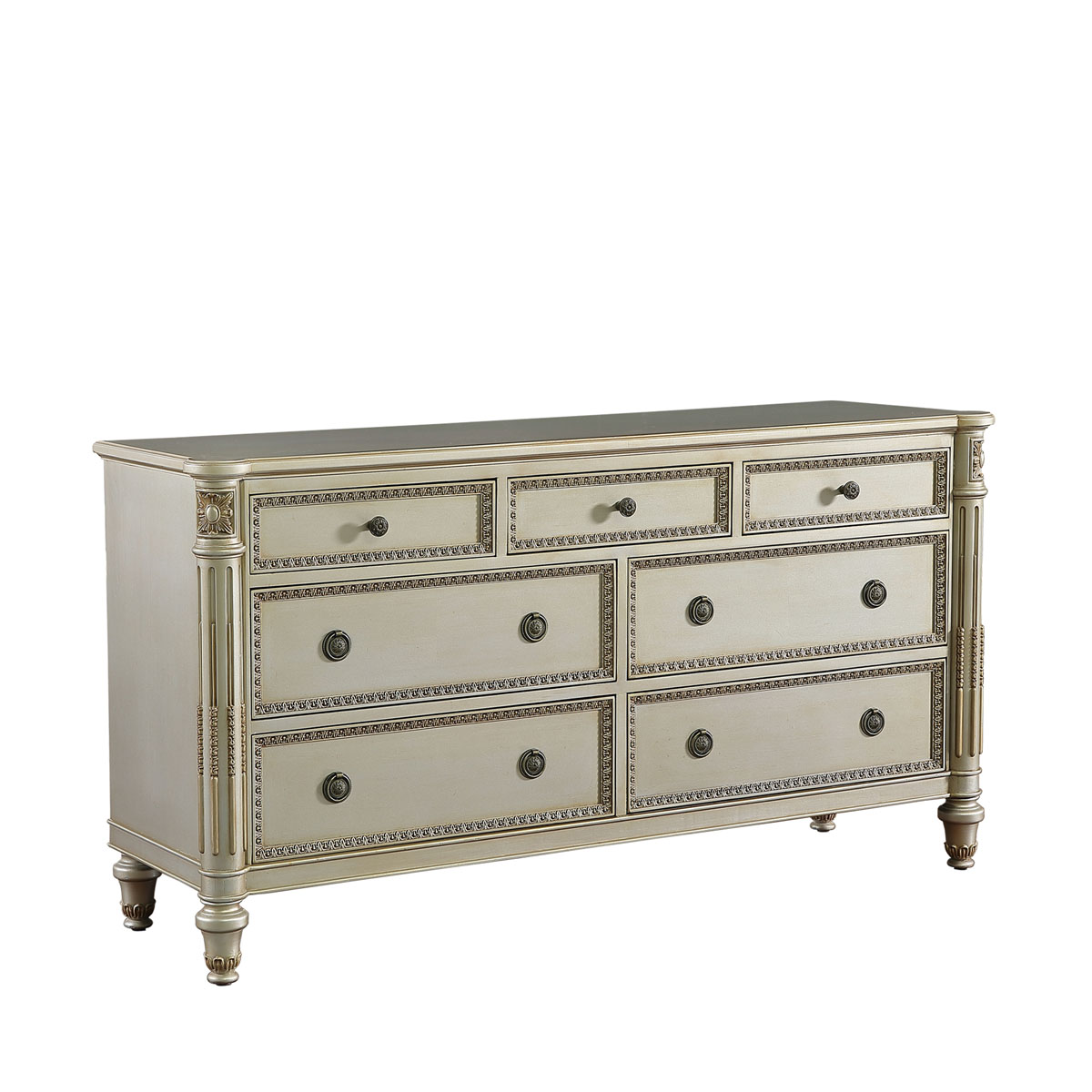 * 手工雕刻的工藝細節 * 七個儲物抽斗,上面中間抽斗可翻下抽斗面(兩側裝有消聲鐵滑軌),可放DVD電器;