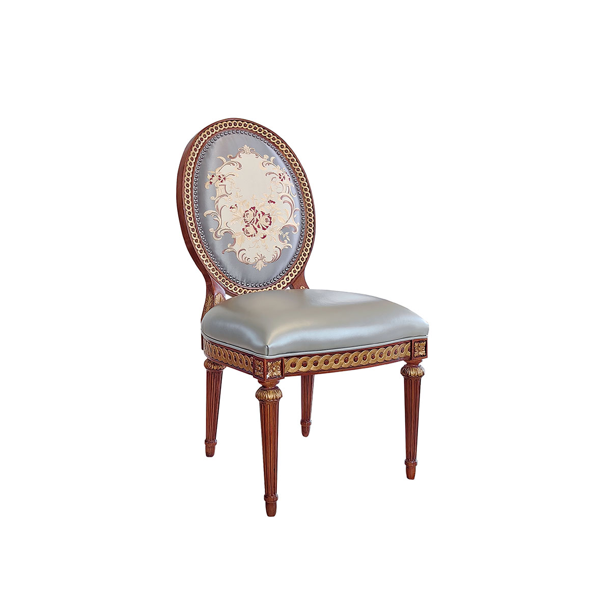 參考18世紀(jì)法國(guó)路易十六時(shí)期涂金扶手椅古董設(shè)計(jì),并結(jié)合同時(shí)期的圓面背板設(shè)計(jì)。配上精致的連續(xù)雕刻和貼金鉑工藝、錐形腳設(shè)計(jì)、觸感舒適的布藝和包有豐厚的填充物坐墊和靠背。