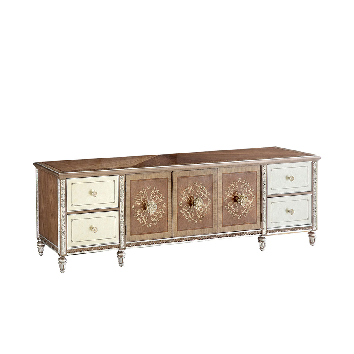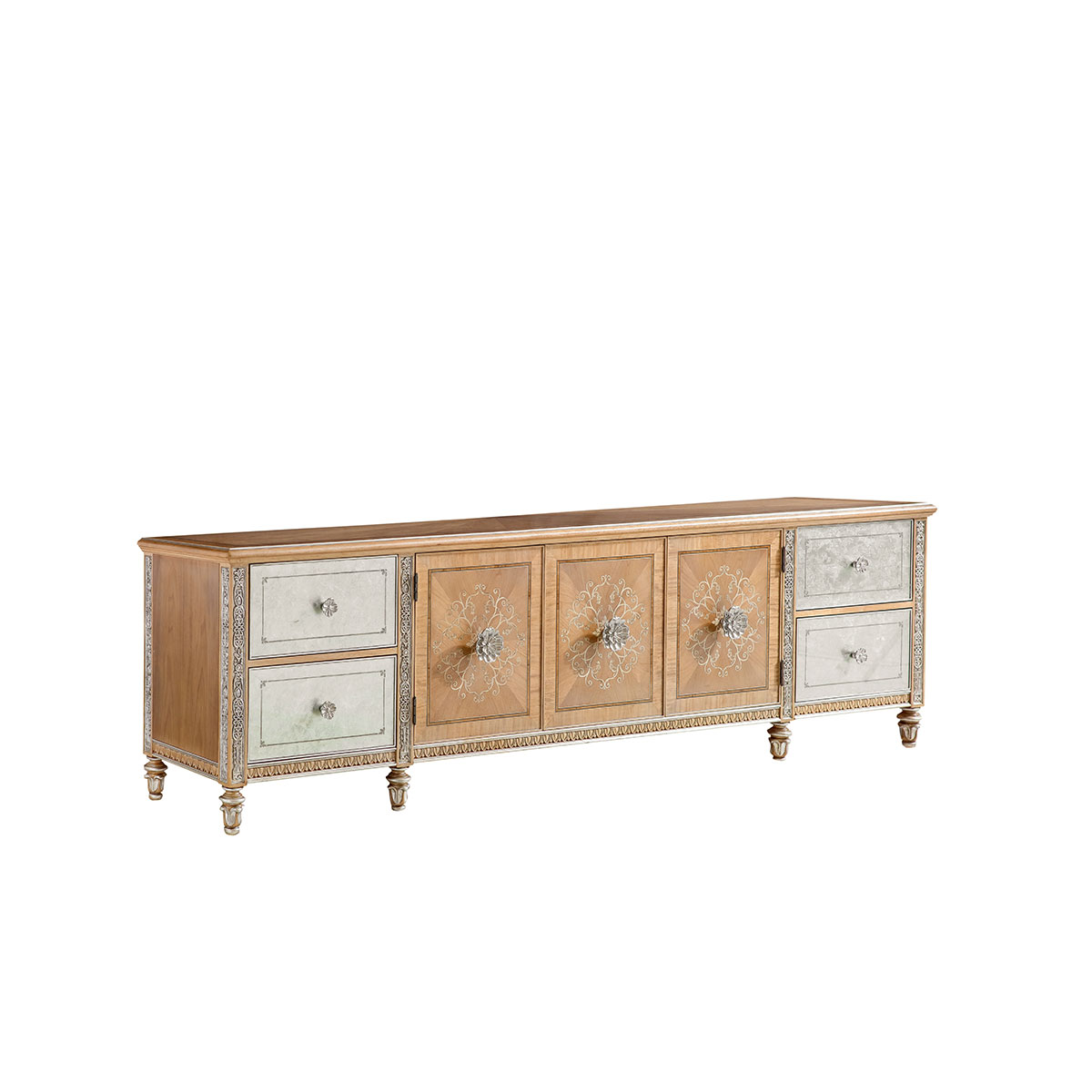 橡膠木+環保人造板+黑胡桃+艷陽花+櫻桃木等木皮貼面+藝術玻璃