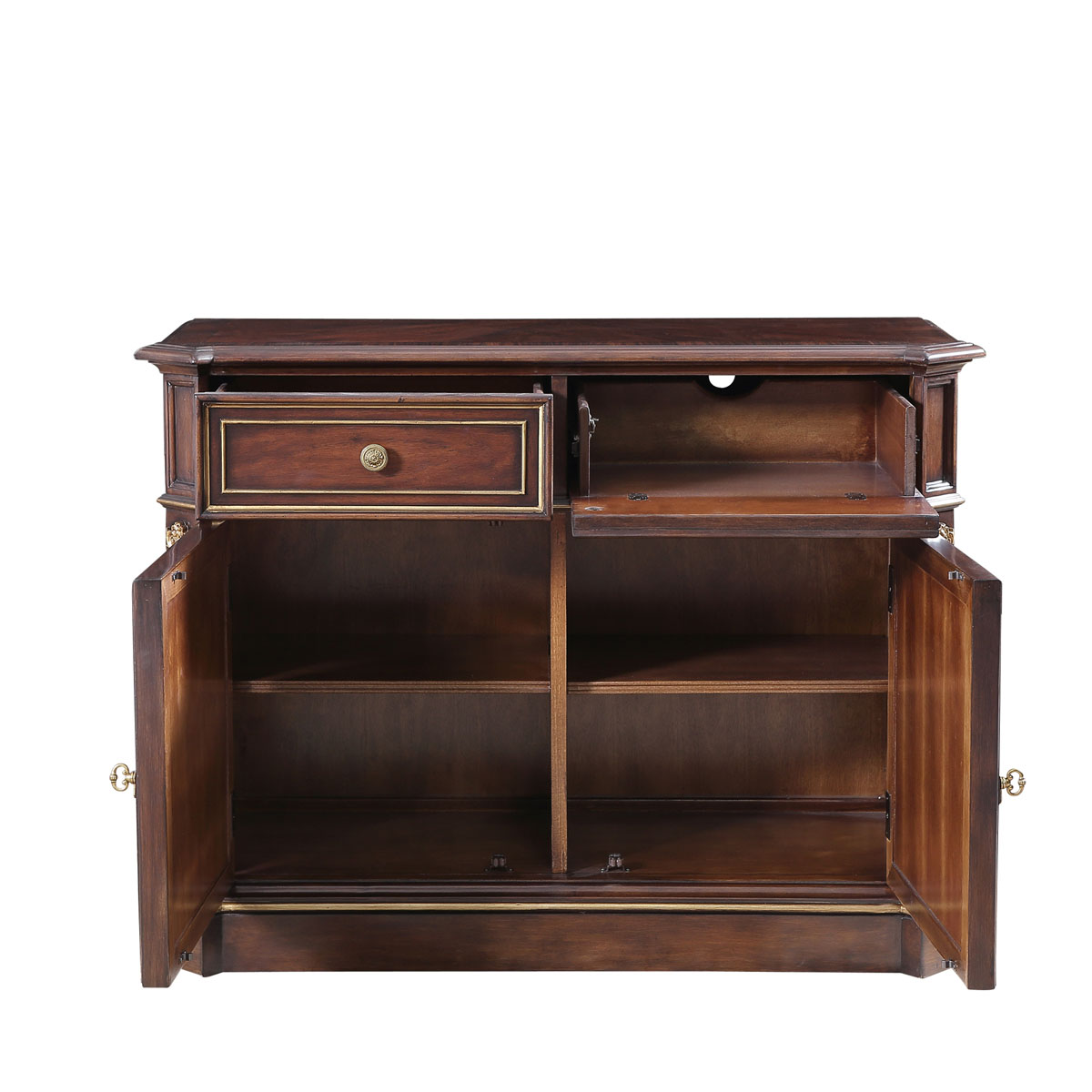 * 書本手繪飾以復(fù)古做舊效果,營造出高雅的文化氛圍; * 精致的手工雕刻細(xì)節(jié)和貼金工藝 * 二個儲物抽斗,采用硬木實木滑軌; * 門內(nèi)一塊可調(diào)層板; * 腳底部裝有可調(diào)整腳釘;