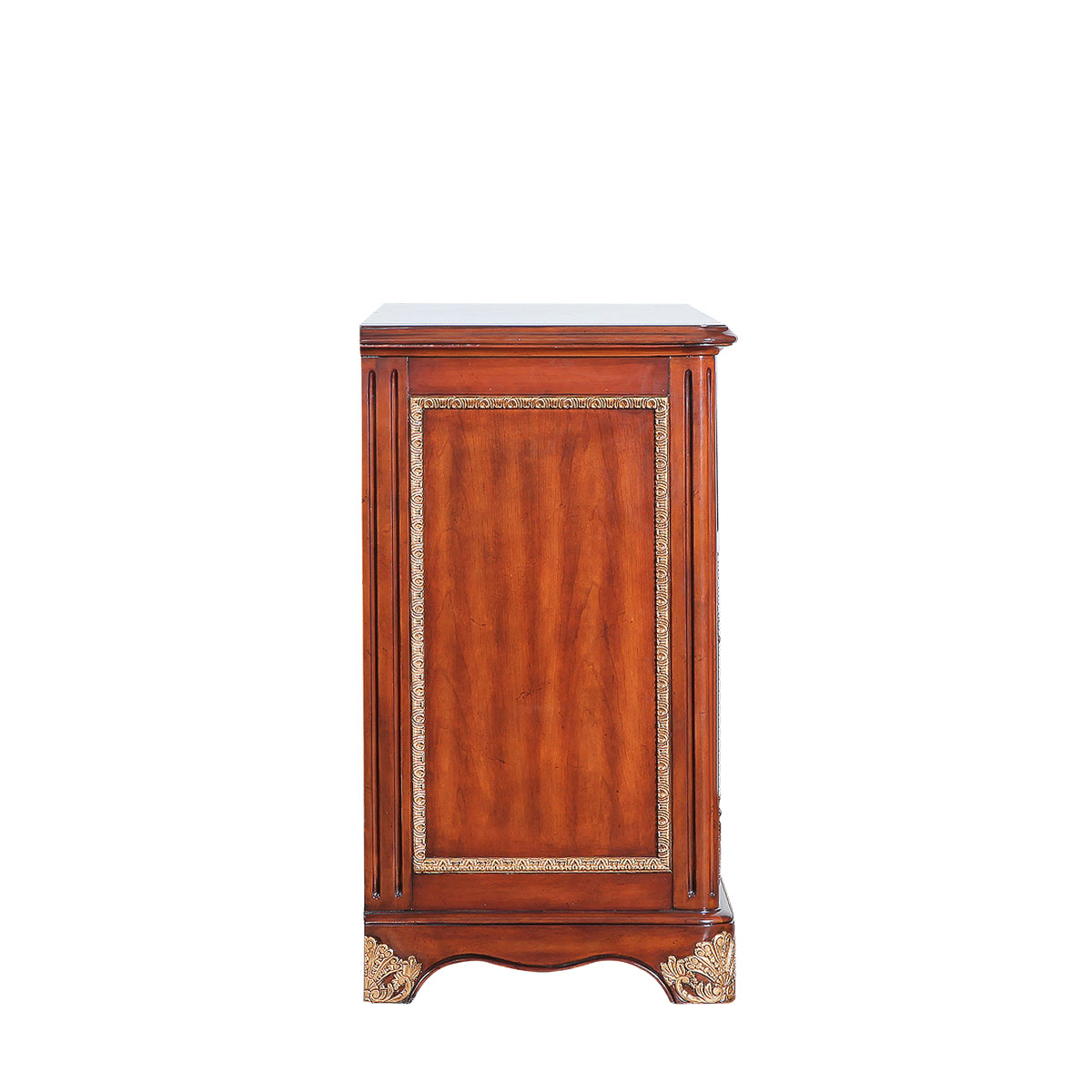 * 為表現(xiàn)英國皇室的華麗和莊嚴,以英國溫莎堡為設(shè)計元素。端莊氣派的造型,厚重優(yōu)雅的色調(diào),配上仿鎖孔設(shè)計與半圓弧黃銅拉手,完美演繹了英式宮廷家具的奢華尊貴,可謂是極具典藏價值的傳世之作。