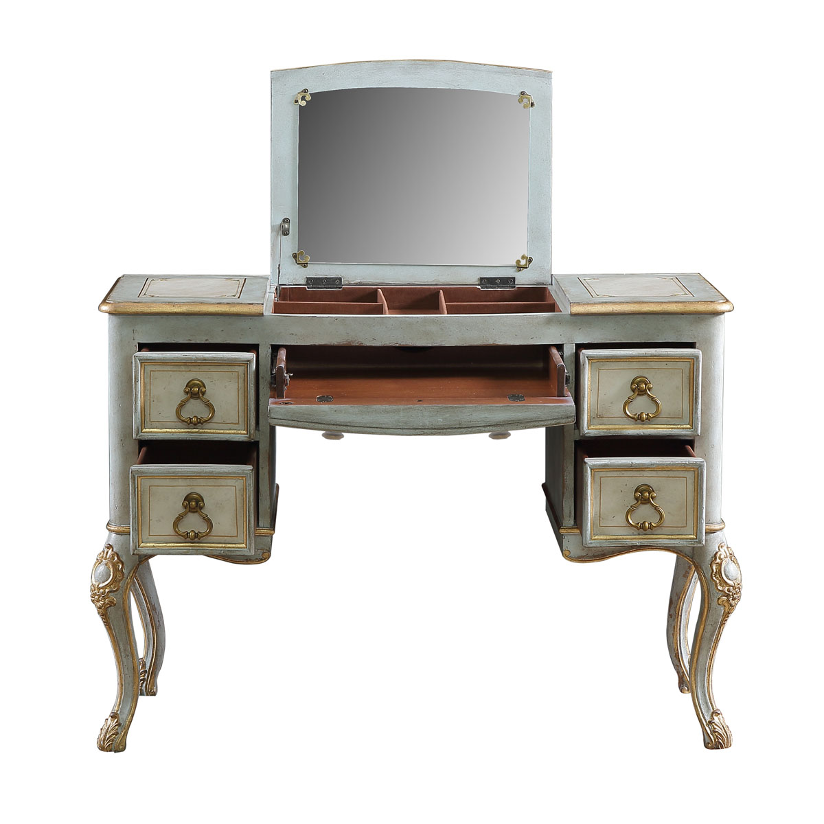 * 四個儲物抽斗,底部采用硬木實木滑軌.中間抽斗的設計可翻下斗面,用來放置鍵盤,抽斗內側有電線孔,抽斗兩邊裝有兩條三節消聲鐵滑軌,滑順耐用; * 中間面板可打開,里面有鏡子和絨布戒指格; * 腳底部裝有可調腳釘