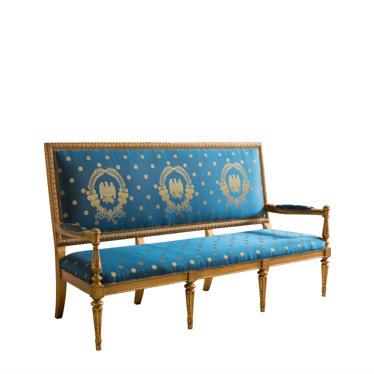 * 這是以美國白宮的Blue Room(藍色房間) 為意念并結合法國元素而設計的沙發。包括建筑雕刻錐形腳、 權杖狀的扶手柱、葉形雕刻外框和貼金鉑工藝,配上代表自由的藍色布藝和包有豐厚的填充物坐墊和靠背。