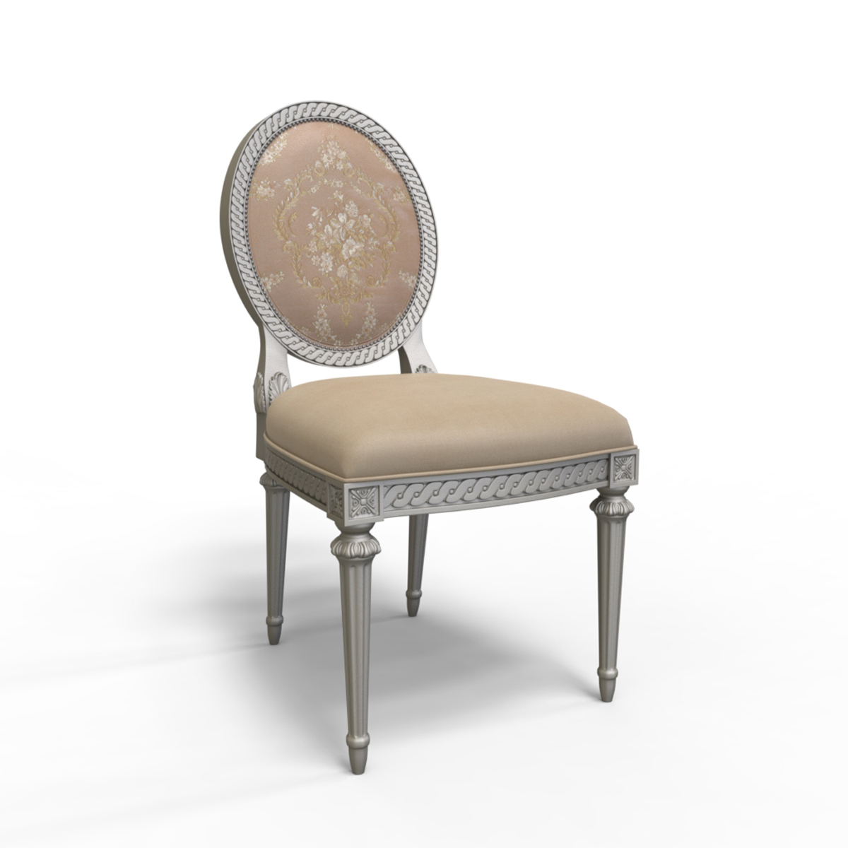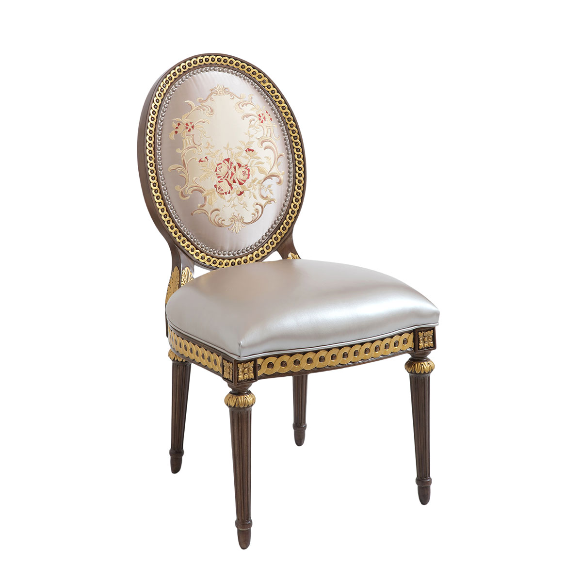 * 參考18世紀法國路易十六時期涂金扶手椅古董設計,并結合同時期的圓面背板設計。配上精致的連續雕刻和貼金鉑工藝、錐形腳設計、觸感舒適的布藝和包有豐厚的填充物坐墊和靠背。