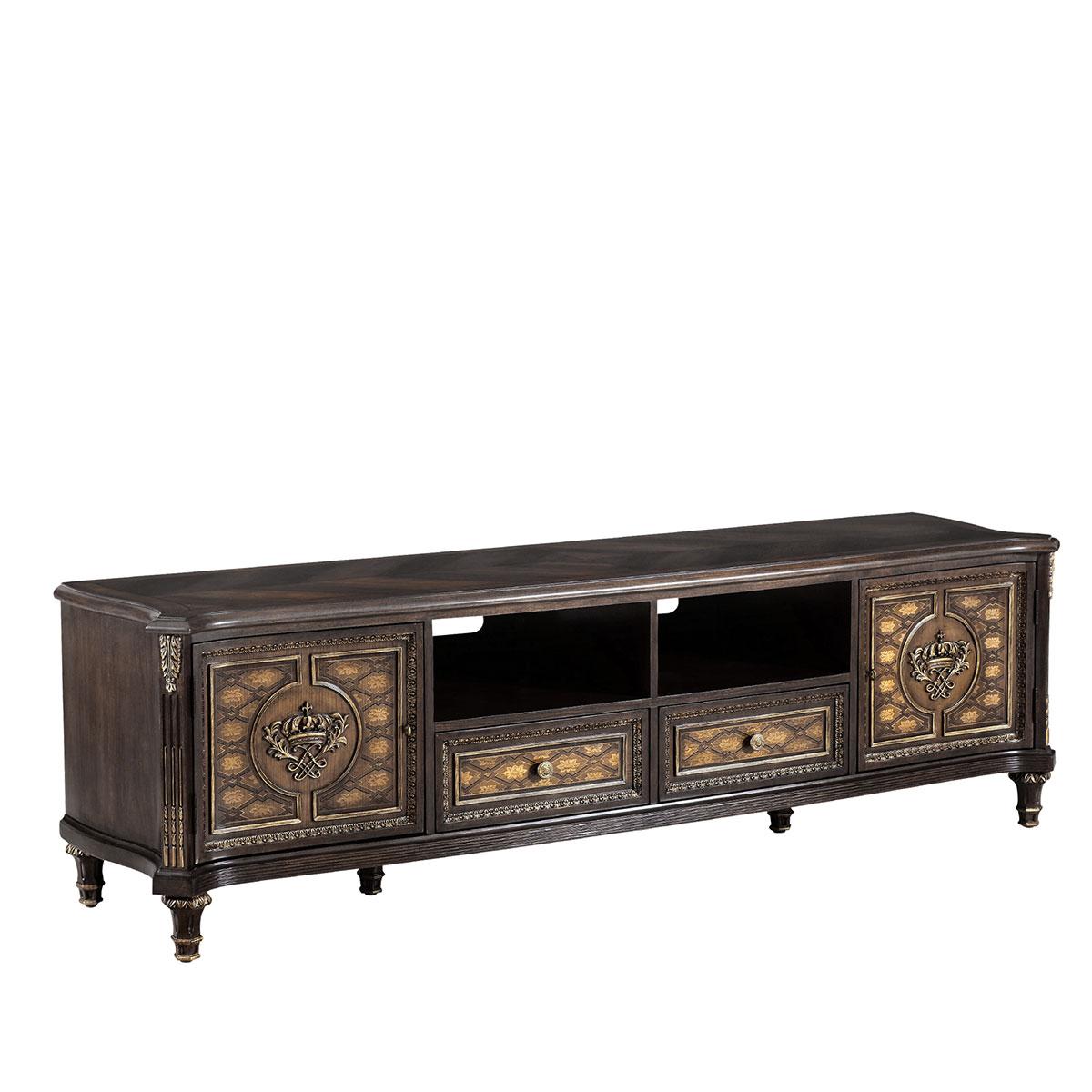 凡爾賽玫瑰電視柜 以 Louis路易時期 Bombe Chest(邦貝柜)新古典風格為設計靈感,多種珍稀木皮貼飾成的木皮拼花清晰美觀,斗面鑲嵌路易十四太陽王的“L”字圖騰雕刻,沐浴著太陽之光象征王權榮耀,