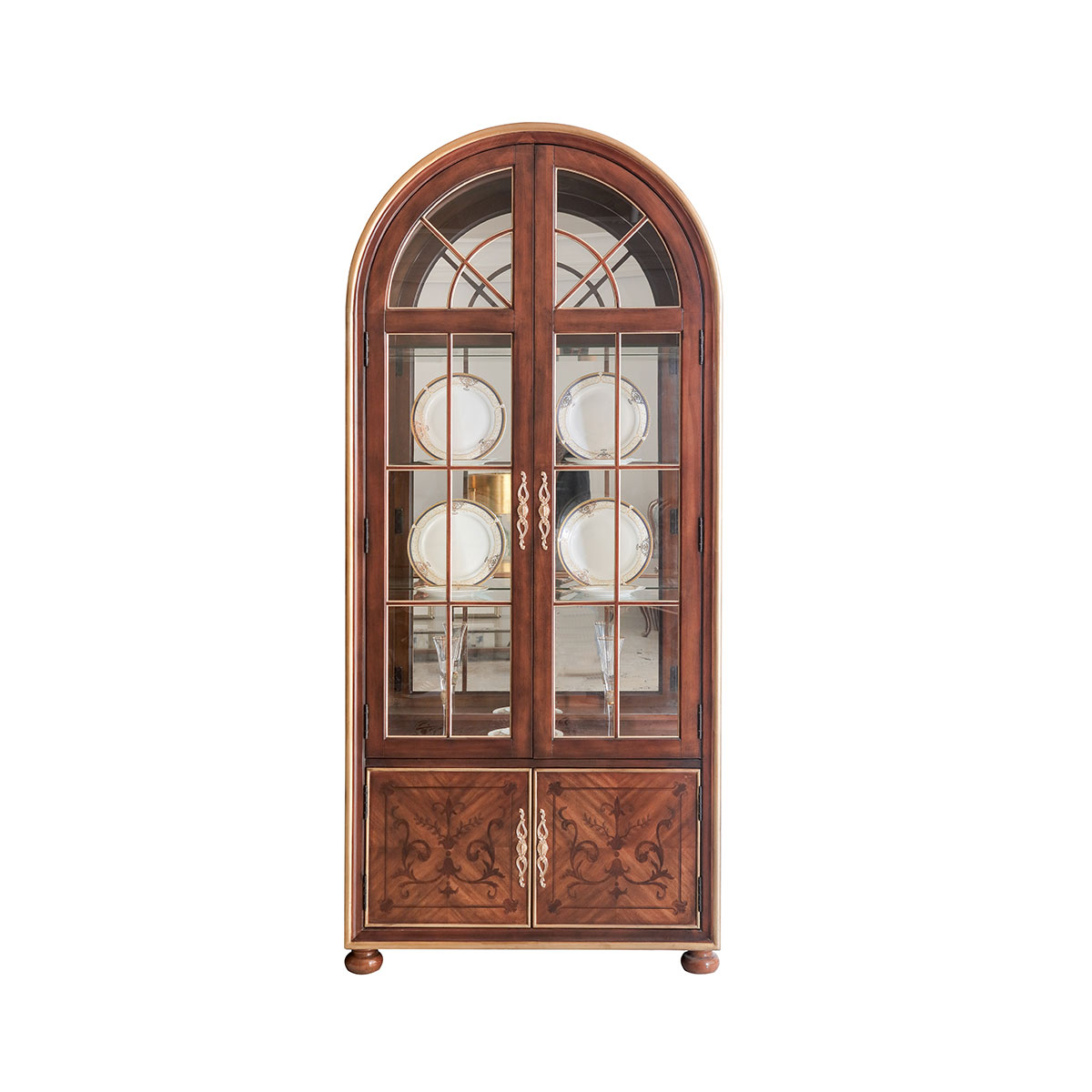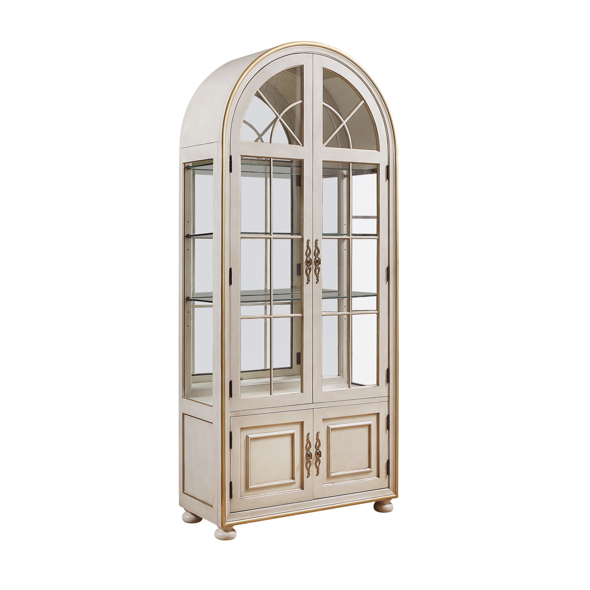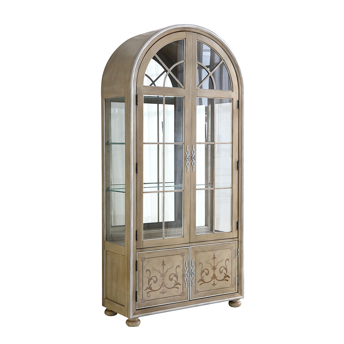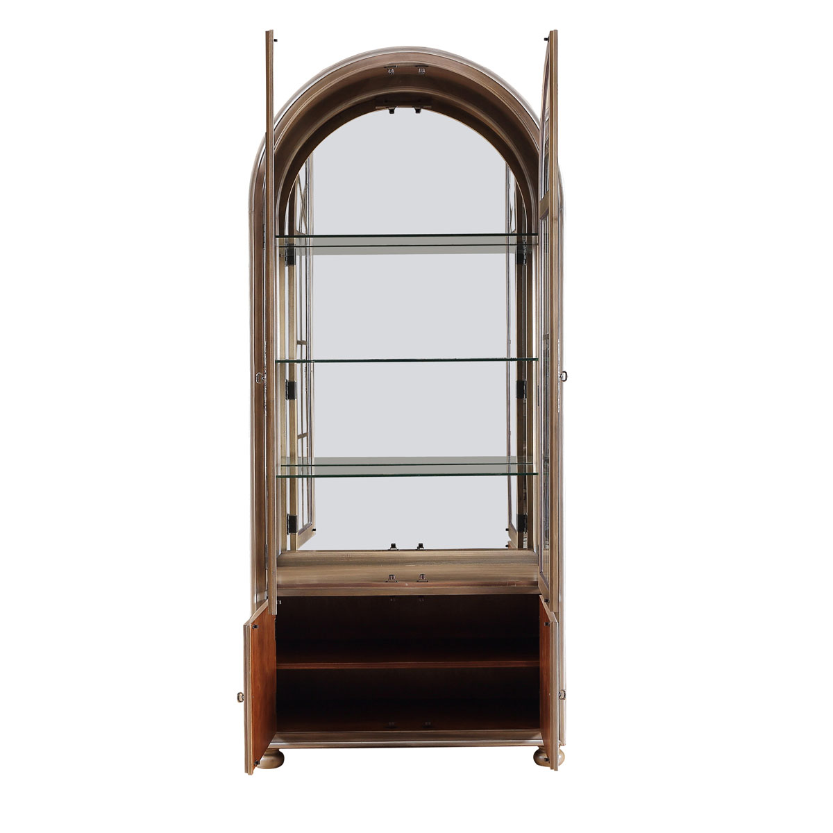 * 門內有三塊玻璃層板,背板處裝有背鏡,使柜身內部的光線更通亮; * 下門內有一塊可調木制層板;