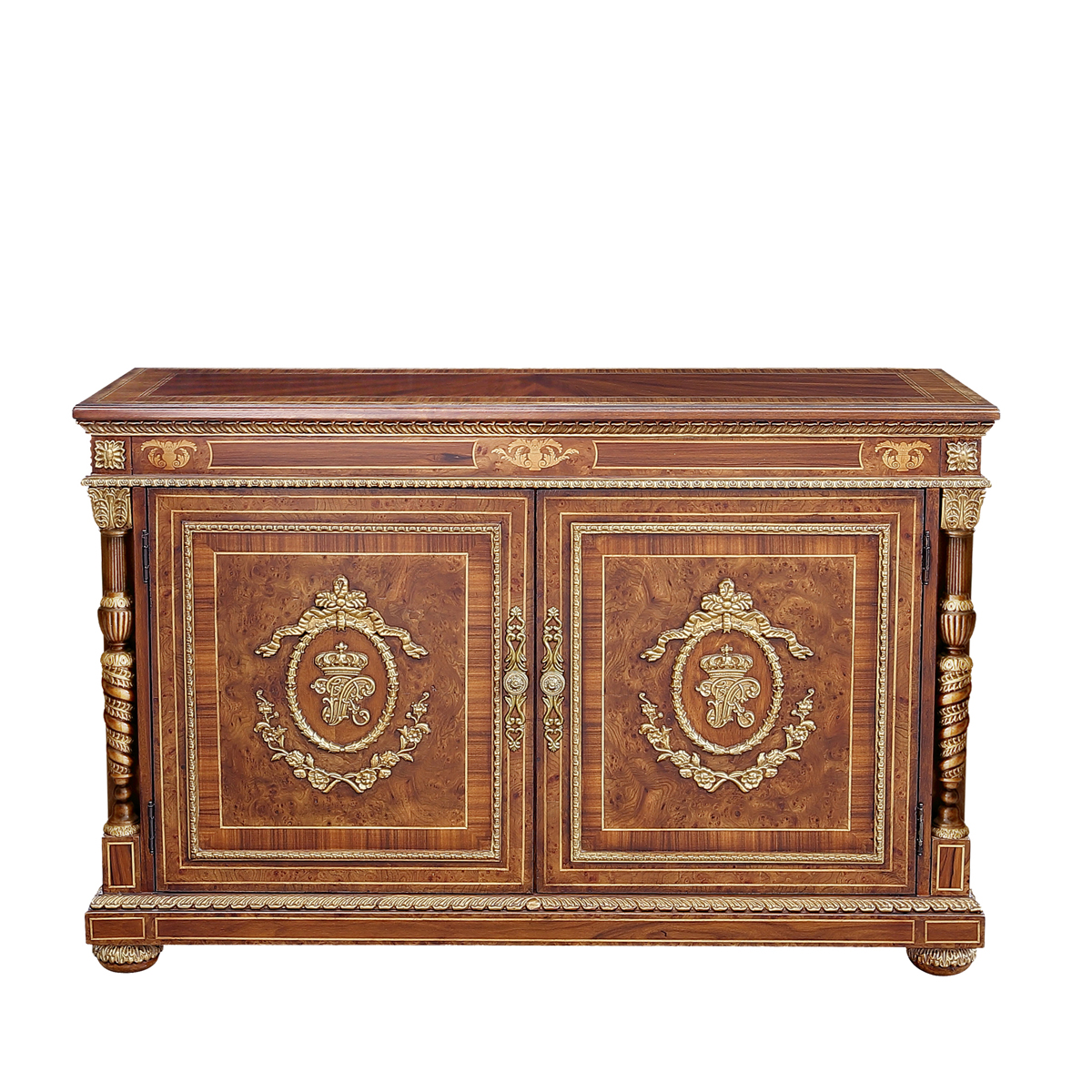 為表現(xiàn)英國皇室的華麗和莊嚴,以英國溫莎堡為設計元素。使用雕刻描金葉飾花紋,表現(xiàn)出英國王室的典雅氣質(zhì),配上代表勝利的支撐柱、精致的手工雕刻細節(jié)和貼金箔工藝,完美演繹了英式宮廷家具的奢華尊貴,可謂是極具典藏價值的傳世之作。