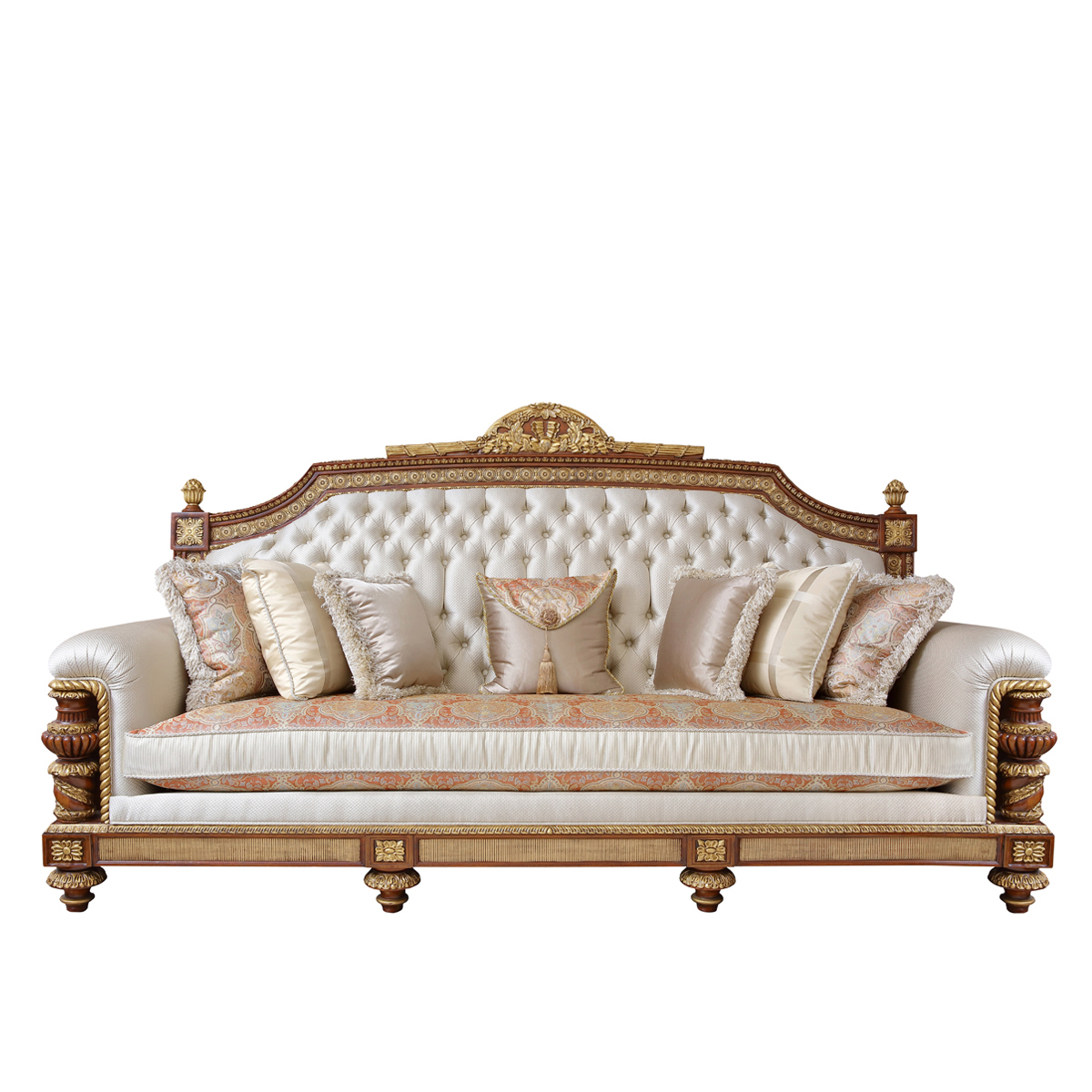 * 以英國溫莎城堡中喬治四世時期的臥床為設計意念,使用皇家御用的桃花心木為主要材質,配以精致的雕刻和貼金工藝,表達英國皇室尊貴的地位。同時使用舒適的軟包和柔順的布藝,使藝術和生活結合,表達英國君王客廳應有的品質,是溫莎堡系列英式沙發的特色。